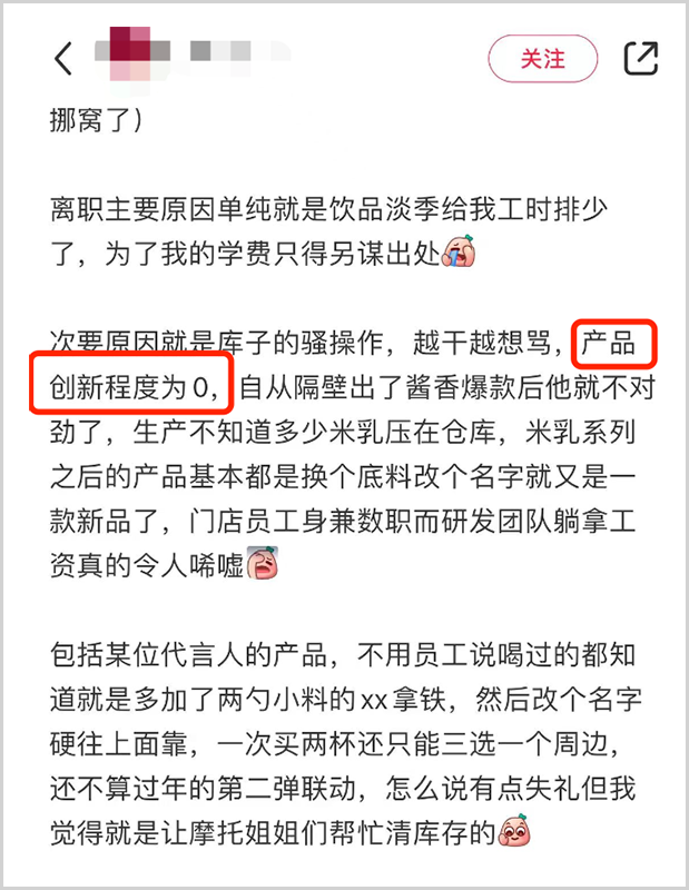 而從在庫迪門店工作過的員工曝出的,庫迪“產(chǎn)品創(chuàng)新程度為0”的堪稱敷衍的研發(fā)態(tài)度看,其要摘下“難喝”標簽怕是沒那么容易。
