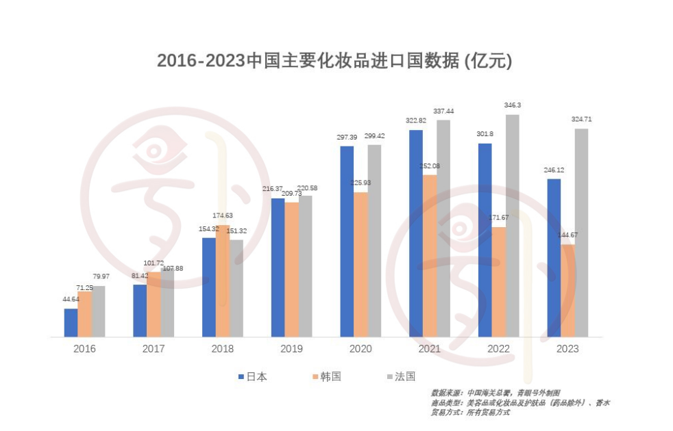 海關(guān)總署的數(shù)據(jù)顯示,2023年中國(guó)對(duì)法國(guó)進(jìn)口化妝品額達(dá)到了324.71億元,過(guò)去五年穩(wěn)居中國(guó)最大的化妝品進(jìn)口國(guó)。排在第二的是日本,對(duì)日本進(jìn)口額為246.12億元,韓國(guó)為144.67億元,排在第三。