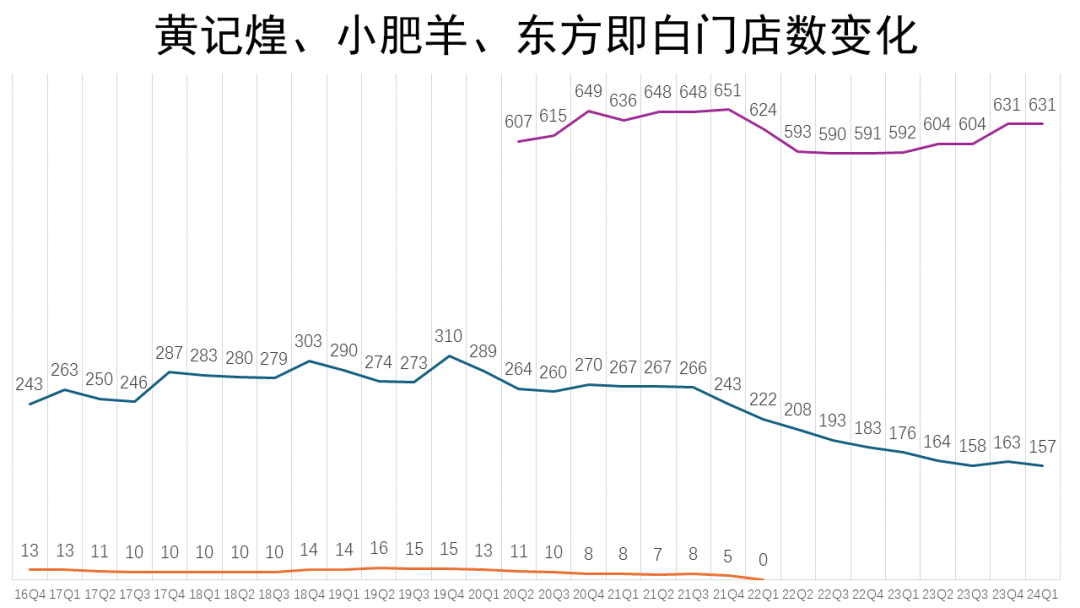 比起小肥羊,黃記煌的發(fā)展相對(duì)來(lái)說(shuō)比較幸運(yùn)。2014-2016年,黃記煌營(yíng)收逐步下滑,此后,一度風(fēng)傳「倒閉」。2020年,百勝中國(guó)完成了對(duì)黃記煌的收購(gòu),黃記煌門店數(shù)從2020年6月的600多家,增至2024年一季度末的631家。