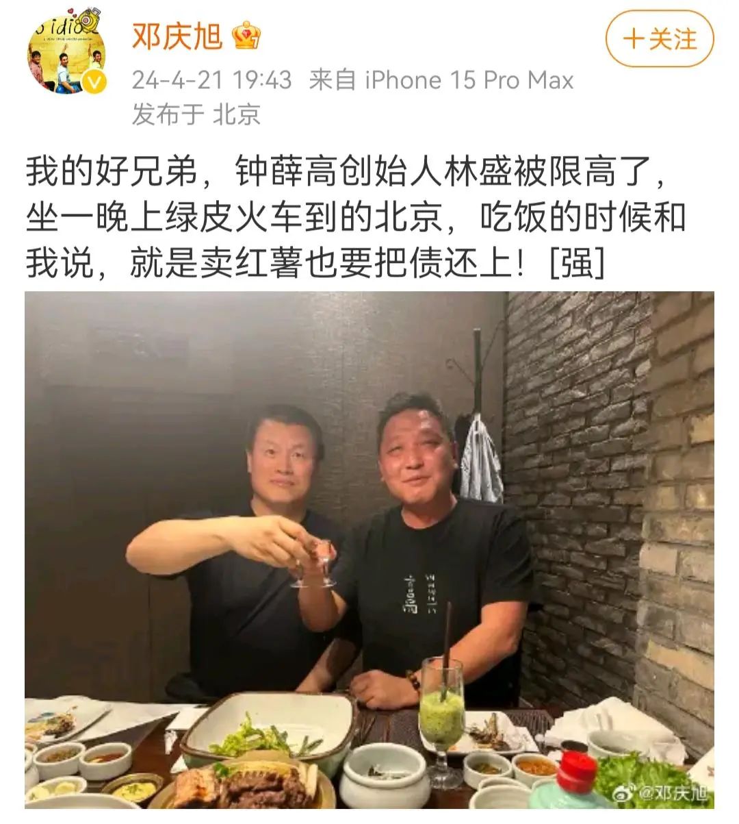 今年4月,新浪財經(jīng)CEO鄧慶旭發(fā)了一條微博,表示鐘薛高創(chuàng)始人林盛被限高了,但坐了一夜綠皮火車到北京和他見面,“就是賣紅薯也要把債還上”,隨后又補充林盛直言自己“不跑不賴不慫”。