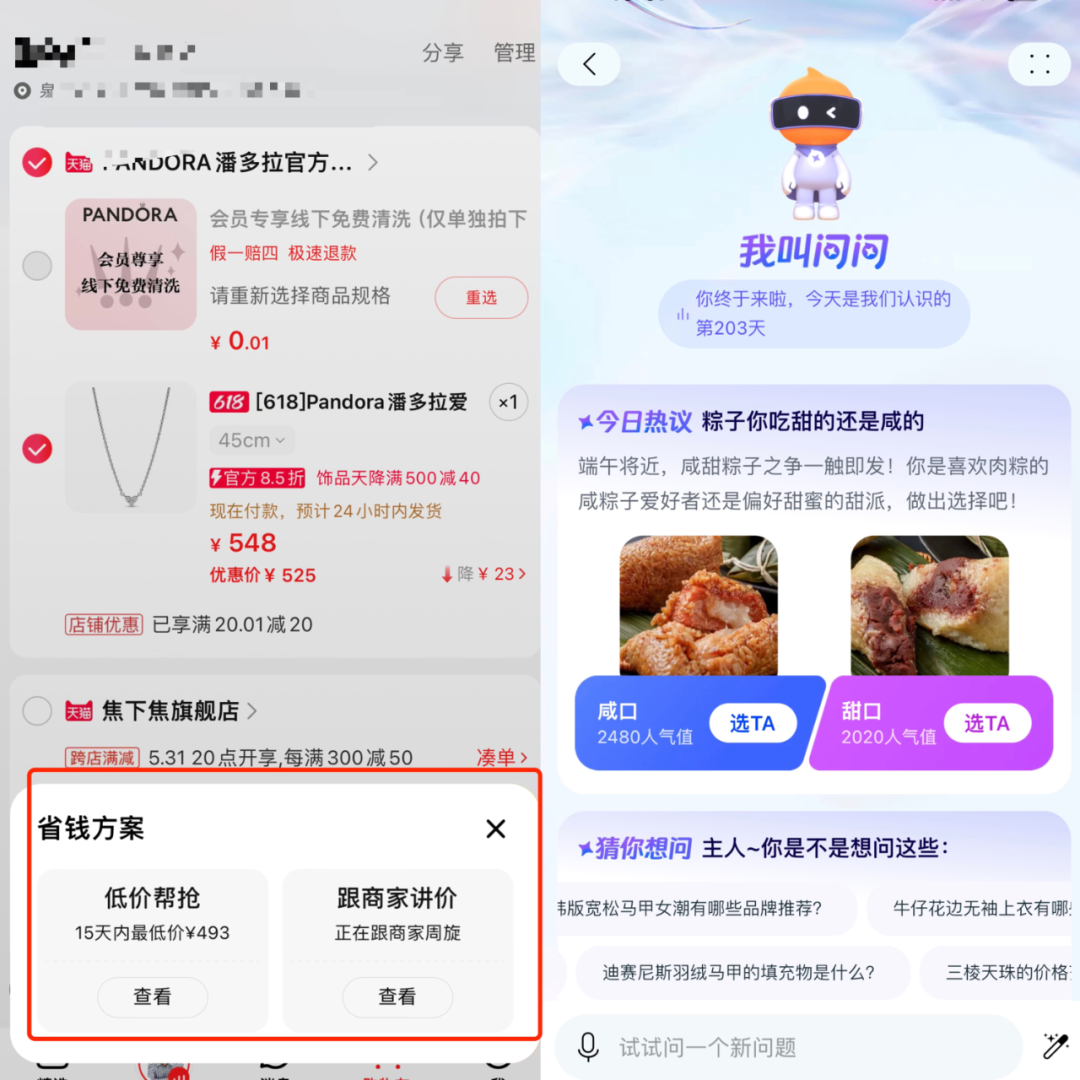 “AI講價(jià)小助手”(左),淘寶問問(右)