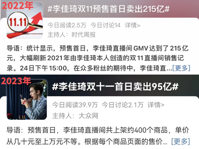 受諸多影響,李佳琦直播間的帶貨能力走弱,2023年雙十一大促期間,李佳琦直播間業(yè)績開始下滑,據(jù)相關(guān)統(tǒng)計分析,其預(yù)售首日銷售額為95億元,相比2022年的215億元,下滑了55.81%,此外“生意參謀”分析數(shù)據(jù)顯示,9月李佳琦直播間搜索分析的交易指數(shù)較8月下滑了23.45%,支付轉(zhuǎn)化率更是跌了36.87%。