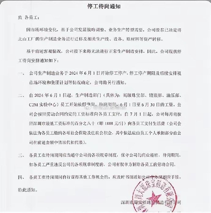聯(lián)商快訊:6月5日消息,網(wǎng)傳深證市周大福珠寶制造有限公司發(fā)布《停工待崗?fù)ㄖ贰?/p>