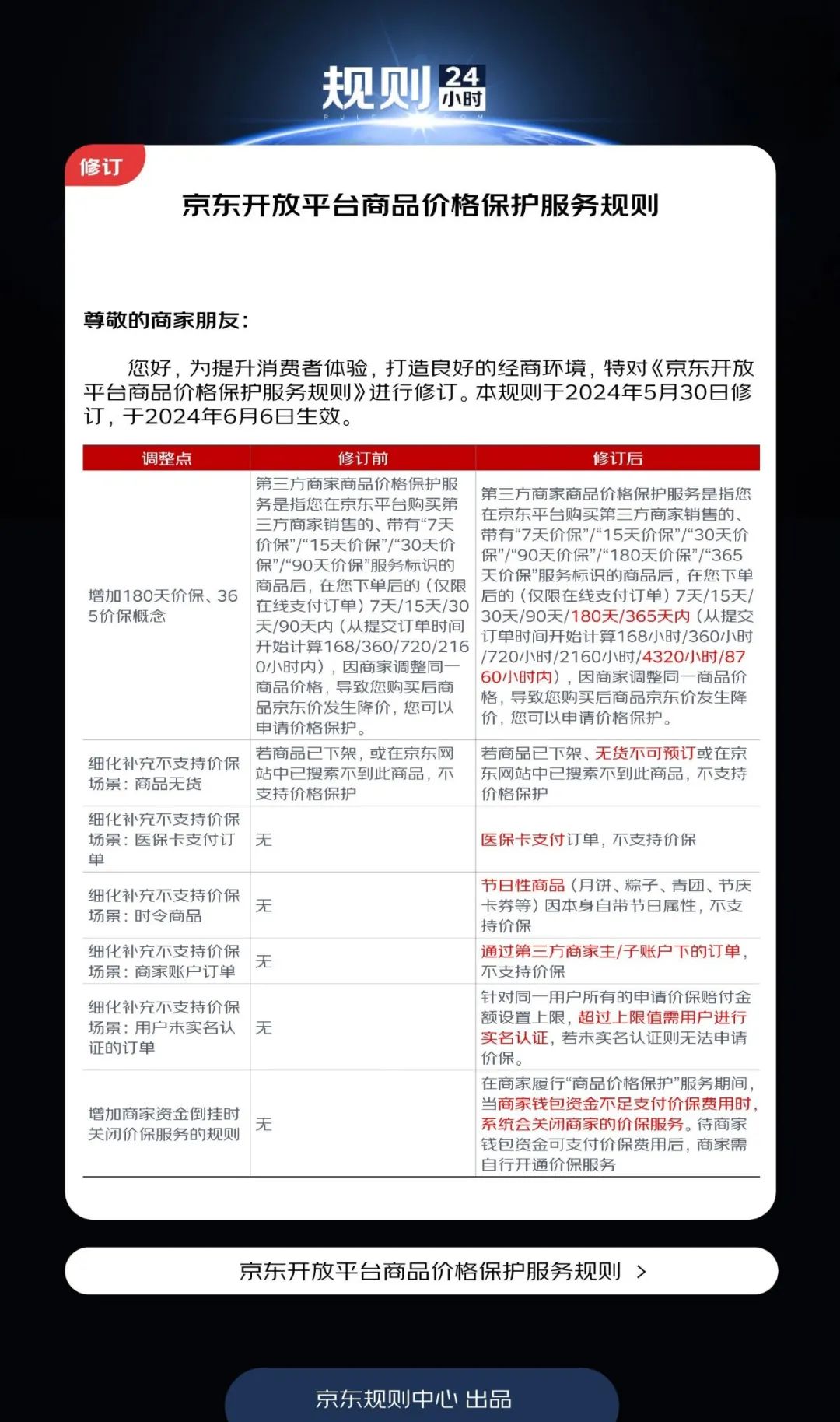 5月30日,京東針對(duì)《京東開放平臺(tái)商品價(jià)格保護(hù)服務(wù)規(guī)則》進(jìn)行了修訂,并于6月6日正式生效。