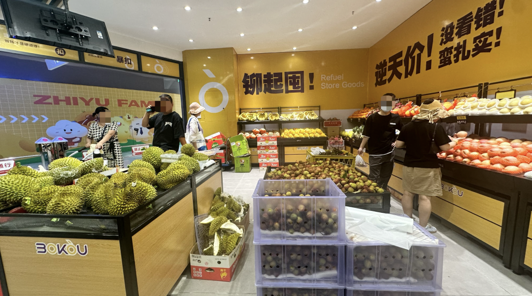 門店左側(cè)為生鮮區(qū),榴蓮、荔枝與西瓜在開業(yè)當(dāng)天承擔(dān)著主要的引流作用,但這三個(gè)商品并未有明確價(jià)簽,其中做活動(dòng)的西瓜售價(jià)為2.99元/斤,這與百果園西瓜的正常售價(jià)相同。