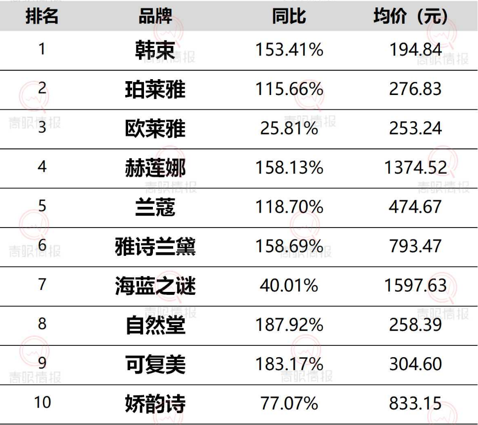 比如韓束,5月份在抖音取得了超6億元的GMV,同比增長153%,連續(xù)七個月登頂抖音護膚榜首。珀萊雅GMV超4億元,還有自然堂、可復美等都有三位數(shù)增長。
