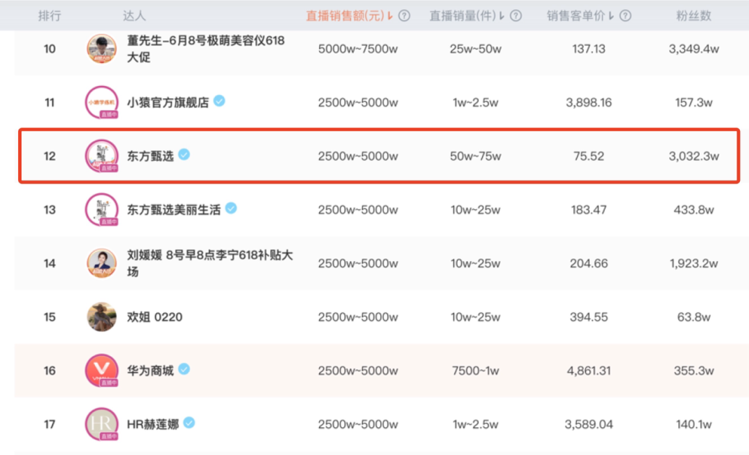 此外,根據(jù)蟬媽媽帶貨達人月度榜單顯示,東方甄選在去年12月份還處于榜單第一的位置,但從今年1月份開始,從第4名一路跌到4月份的第9名。而在6月1日-6月6日的帶貨達人榜單上,東方甄選已經(jīng)跌出前10,位列第12名。