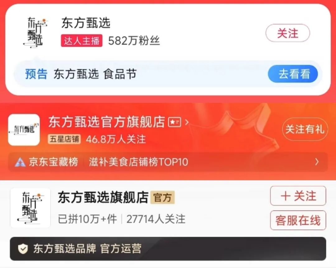 自此,東方甄選又開始嘗試多平臺發(fā)展,并且在去年8月官宣入駐淘寶直播,而后又在京東、拼多多開店賣貨。不過,東方甄選的多平臺發(fā)展策略并未取得明顯的進展。除淘寶店鋪擁有582萬粉絲外,東方甄選京東店鋪僅有46.8萬人關注,拼多多東方甄選旗艦店更是只有2.7萬人關注。