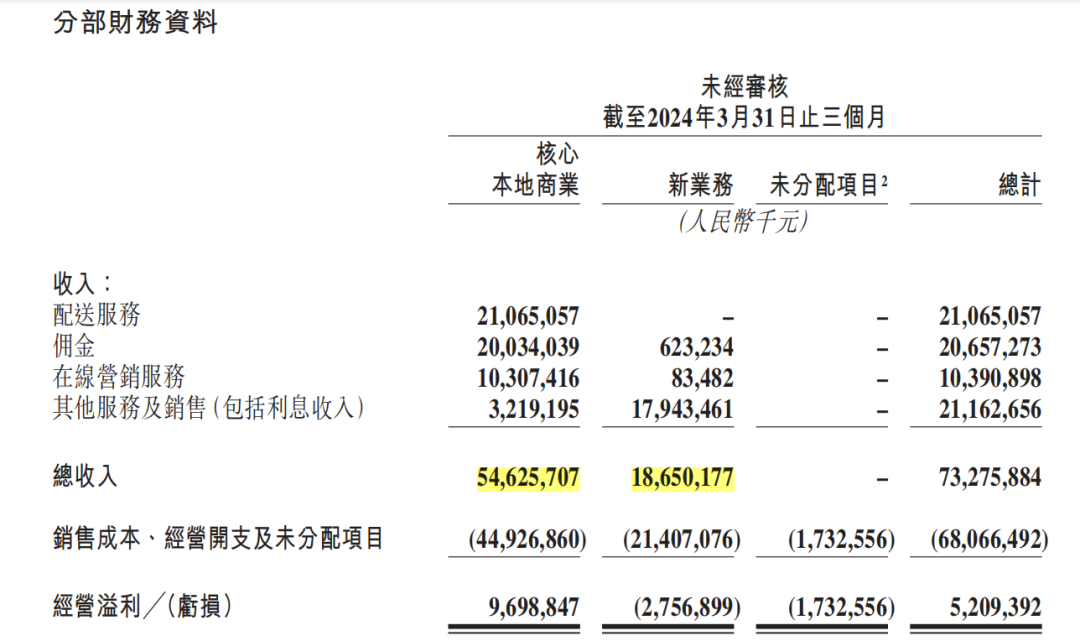 財(cái)報(bào)中最亮眼的數(shù)據(jù)為核心本地商業(yè)分部的收入以及即時配送交易筆數(shù),前者同比增長27.4%,后者同比增長28.1%。此外,新業(yè)務(wù)分部虧損由去年同期的50億元收窄至28億元,經(jīng)營虧損率改善至14.8%。