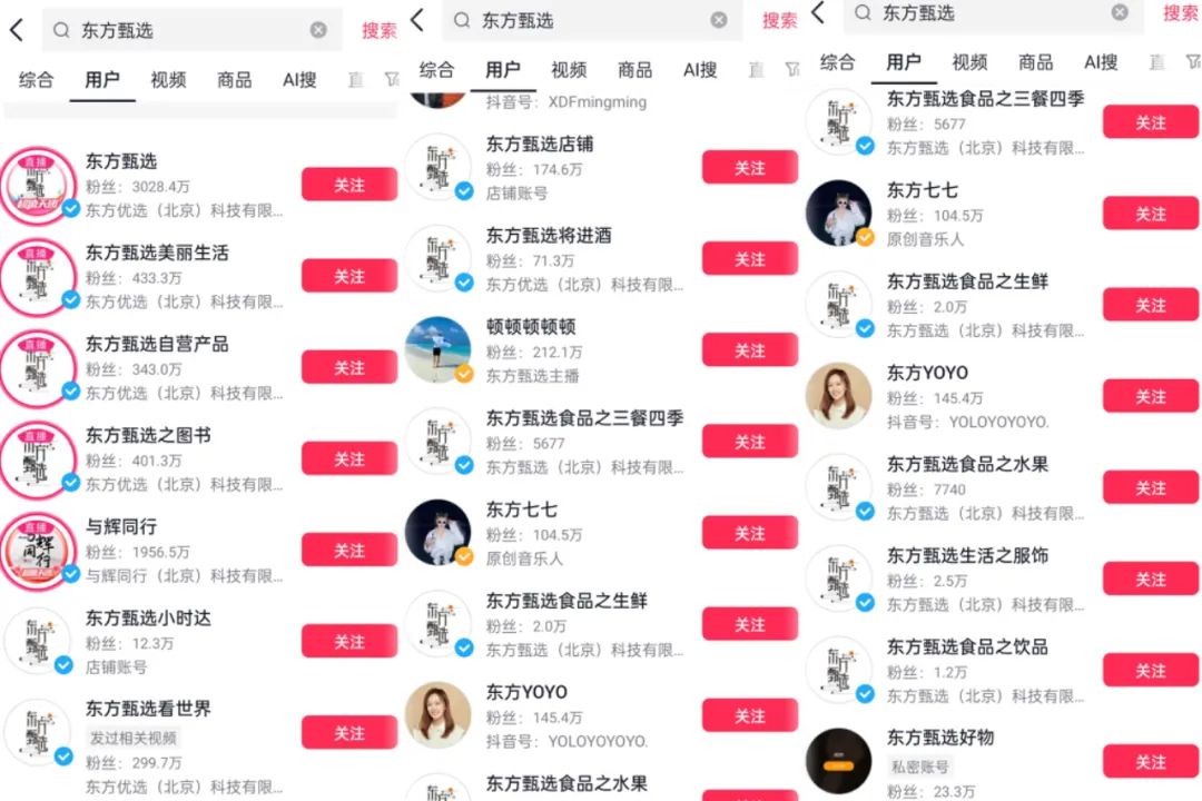 除了單飛的“與輝同行”之外,在抖音,目前東方甄選的矩陣帶貨賬號已經(jīng)增加至16個(不包含東方甄選主播個人賬號)。其中,規(guī)模最大的東方甄選粉絲量達到3000萬+,東方甄選美麗生活、東方甄選之圖書、東方甄選自營產(chǎn)品等,粉絲量也高達數(shù)百萬,不乏圖書、茶飲、烤腸等細分垂類賬號。