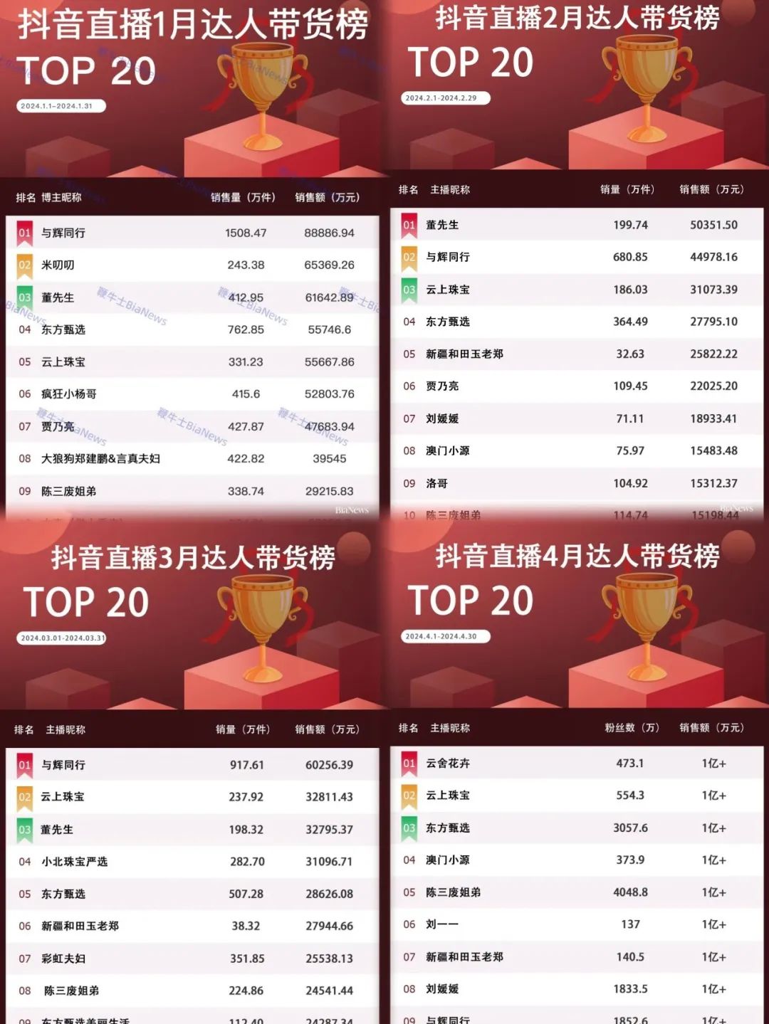 比如,5月登上帶貨榜榜首的賈乃亮,在4月甚至一度跌出了Top20;有著抖音帶貨一哥之稱的小楊哥,今年2月、3月甚至連續(xù)跌出了Top20名單,到了5月才重新入榜位居第6。