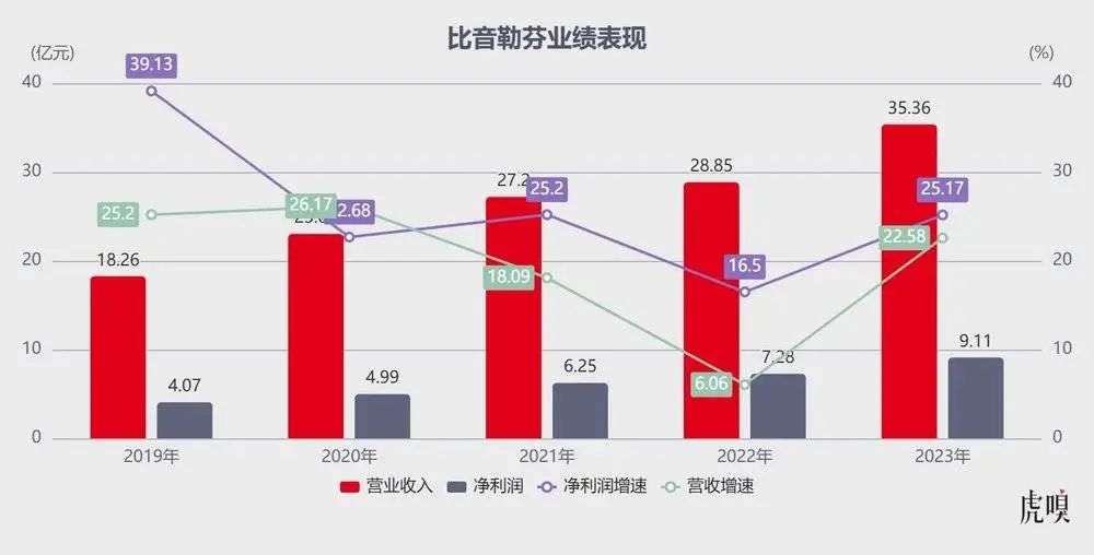 在這些有實(shí)力的中年男性支持下,截至2023年,比音勒芬已經(jīng)連續(xù)十三年實(shí)現(xiàn)營(yíng)收利潤(rùn)雙增。2023年,其營(yíng)收達(dá)到35億元,跟2019年比幾乎翻倍;凈利潤(rùn)也達(dá)到9.1億元。