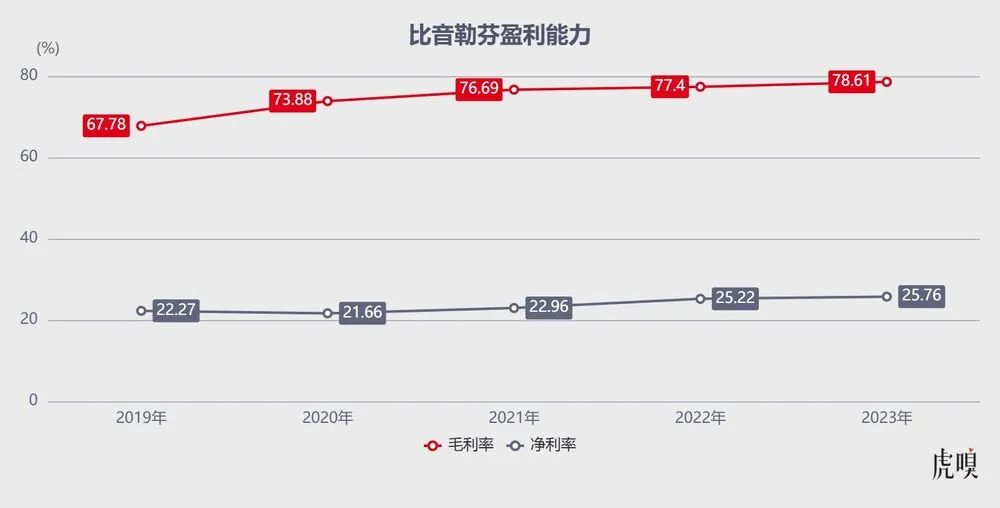 從變化趨勢(shì)看,比音勒芬的毛利率連年上升,從2019年到2023年其毛利率提高了約11個(gè)百分點(diǎn)。