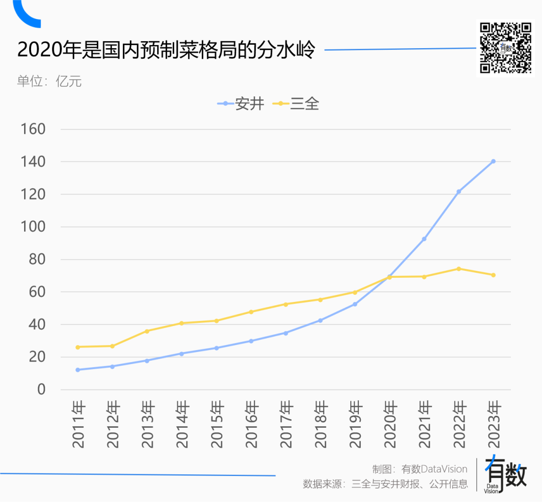 作為預(yù)制菜兩大霸主,安井的業(yè)績在過去十多年一直緊咬三全。但雙方在2020年分道揚(yáng)鑣,安井越戰(zhàn)越勇,營收成倍增長至140.5億;三全則幾乎停滯不前,2023年營收僅為70.6億,出現(xiàn)下滑。