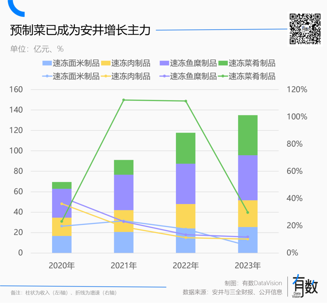 與之對應(yīng),安井的營收結(jié)構(gòu)更加多元,尤其是“速凍菜肴”類目——也就是狹義的“預(yù)制菜”,疫情期間增長喜人,從2020年的6.7億,增長至39.2億,3年4.8倍的成長速度,遠(yuǎn)超于安井的老本行速凍魚糜制品。