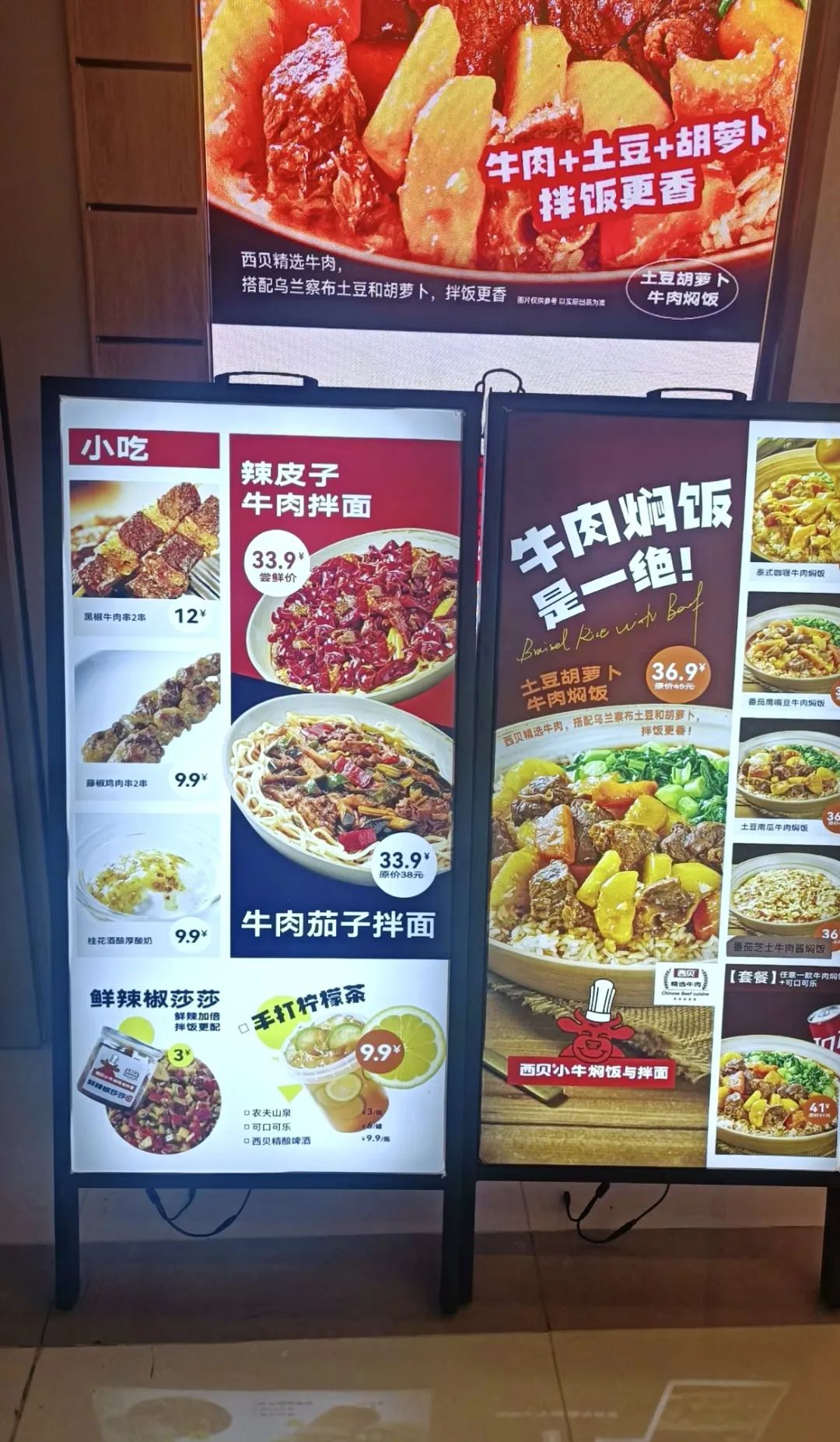 品牌主打牛肉燜飯,推出了土豆胡蘿卜牛肉燜飯、泰式咖喱牛肉燜飯等經(jīng)典蓋澆飯,此外還上線了兩款拌面。