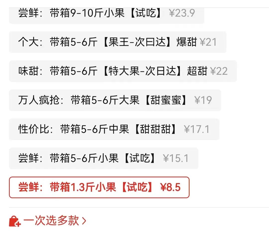 還有消費(fèi)者反饋,在購(gòu)買砂糖橘時(shí),看到宣傳頁(yè)面上標(biāo)價(jià)14.6元10斤的砂糖橘,滿心歡喜地下單,結(jié)果收到的卻是1斤試吃裝。