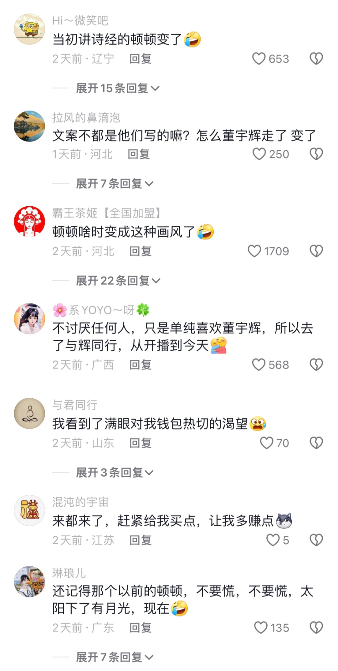 熟悉的配方加上魔性的節(jié)奏,真讓人誤以為走錯(cuò)了直播間。曾經(jīng)的東方甄選可以講詩(shī)經(jīng)、說(shuō)論語(yǔ),充滿詩(shī)情畫意,如今變得與其他直播間無(wú)異,這讓很多網(wǎng)友一時(shí)間難以接受。