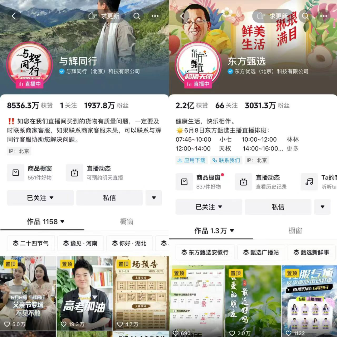截至發(fā)稿前,東方甄選粉絲數(shù)為3031.3萬(wàn),與輝同行粉絲數(shù)為1937.8萬(wàn)。