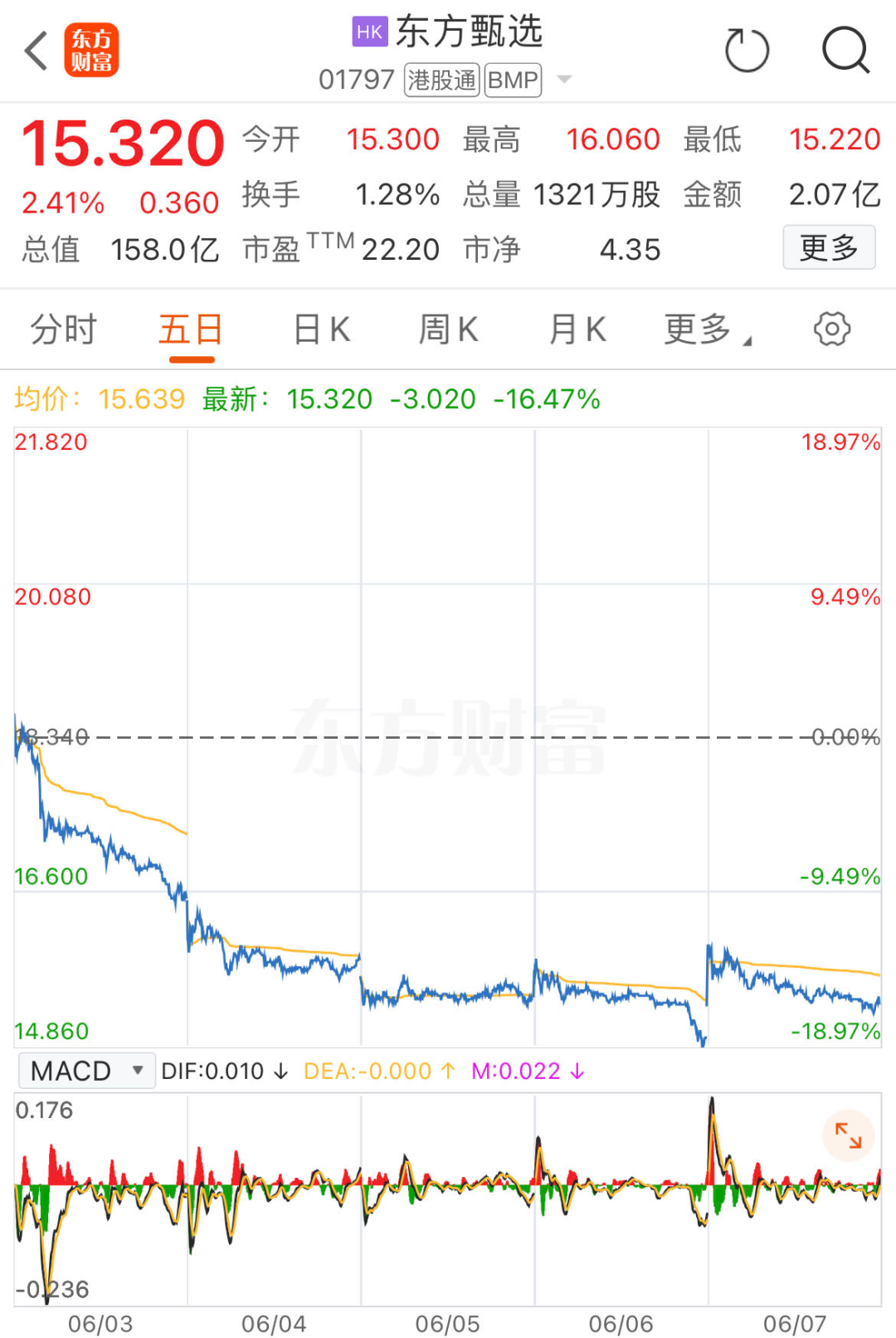 受此番言論影響,當(dāng)天,港股市場(chǎng)漲聲一片,東方甄選股價(jià)卻高開(kāi)低走,大跌9.92%。自5月31日至6月6日收盤,東方甄選股價(jià)在5個(gè)交易日累計(jì)跌幅超22%,且創(chuàng)下了2023年以來(lái)的最低位,市值蒸發(fā)了超43億港元。