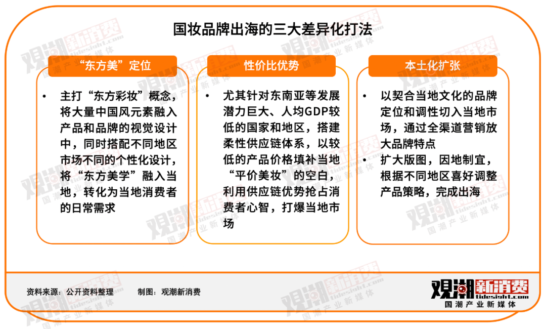 不論是東南亞、日本、北美還是其他國(guó)家和地區(qū),在海外市場(chǎng)的激烈競(jìng)爭(zhēng)中,產(chǎn)品的差異化都是關(guān)鍵。在眾多出海品牌中,三類(lèi)差異化打法——“東方美”定位、性價(jià)比優(yōu)勢(shì)和本土化擴(kuò)張是很多品牌的首選。