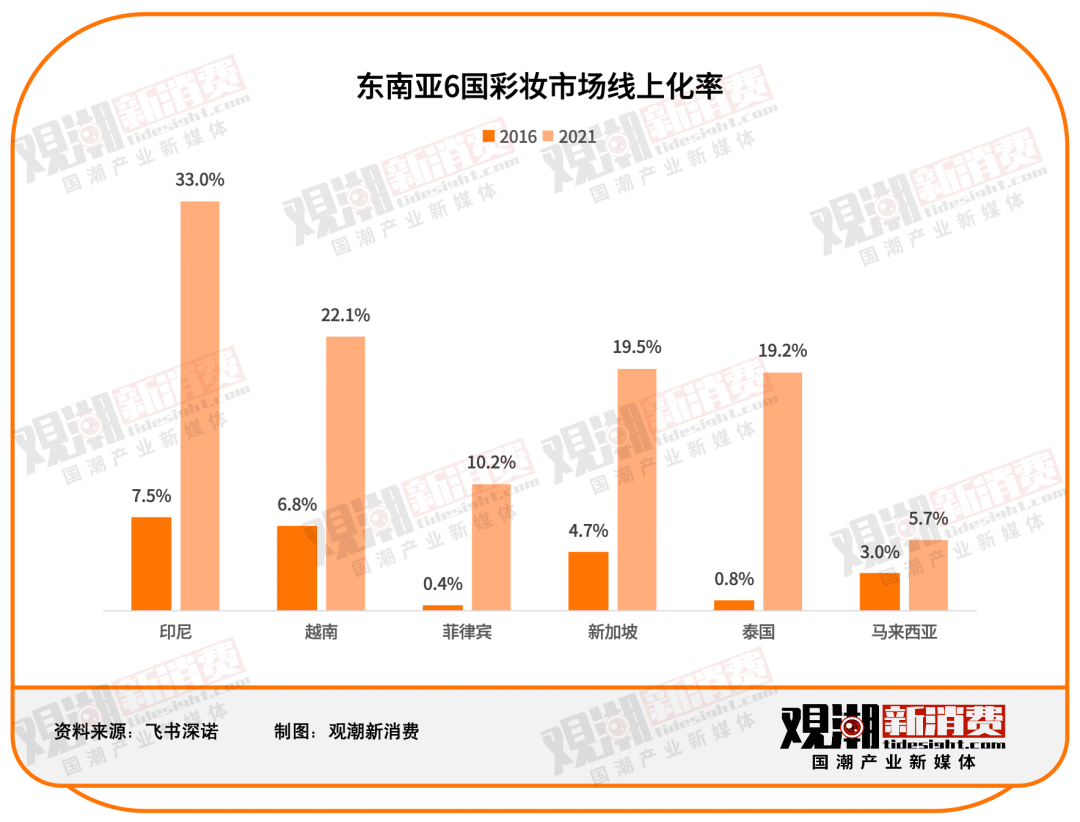 根據(jù)飛書(shū)深諾數(shù)據(jù),東南亞的線上化和電商發(fā)展為國(guó)貨美妝出海奠定了基礎(chǔ)。 隨著電商滲透率的逐步提升,美妝護(hù)膚品類(lèi)也呈現(xiàn)出了快速線上化的趨勢(shì)。 以美妝線上化最高的印尼為例,2016年護(hù)膚品的電商銷(xiāo)售占比僅為1.3%,而2021年已經(jīng)提升至20.9%,彩妝品類(lèi)的線上化率更是突破了3成。