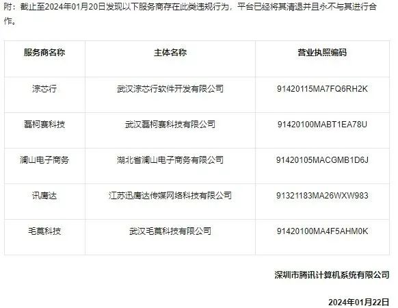 因此,騰訊在今年年初發(fā)布公告,嚴(yán)厲打擊了違規(guī)服務(wù)商,并清退了5家違規(guī)服務(wù)商,以示警戒。