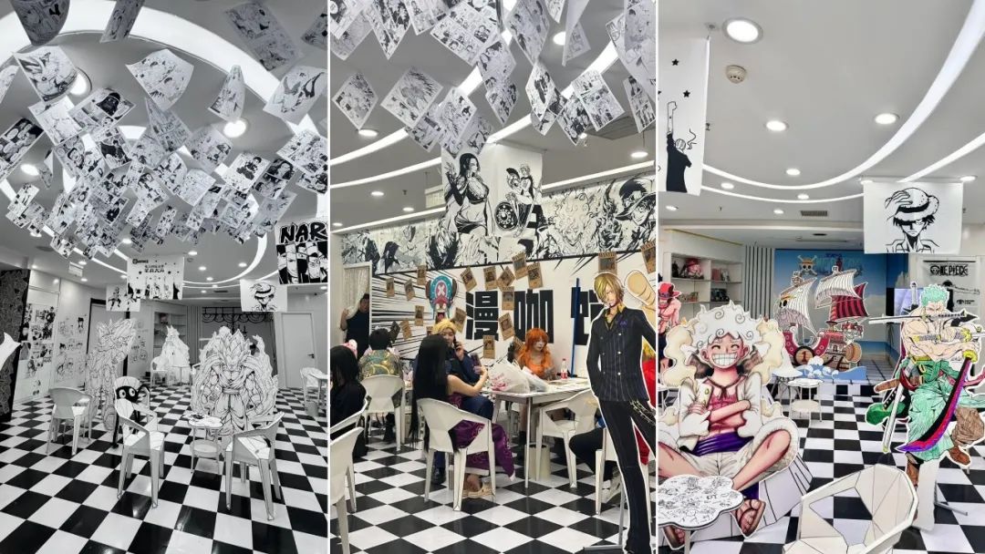 比如最近一期是《獵人》主題,門店墻面就換上了該漫畫的黑白原畫。