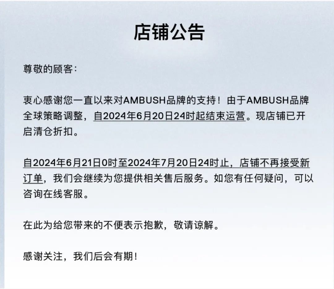 日前,Ambush在天貓旗艦店發(fā)布公告稱,由于全球品牌策略調(diào)整,店鋪將自6月20日24時(shí)起結(jié)束運(yùn)營,現(xiàn)店鋪已開啟清倉折扣。6月21日至7月20日期間,店鋪將不再接受新訂單,但繼續(xù)提供售后服務(wù)服務(wù)。