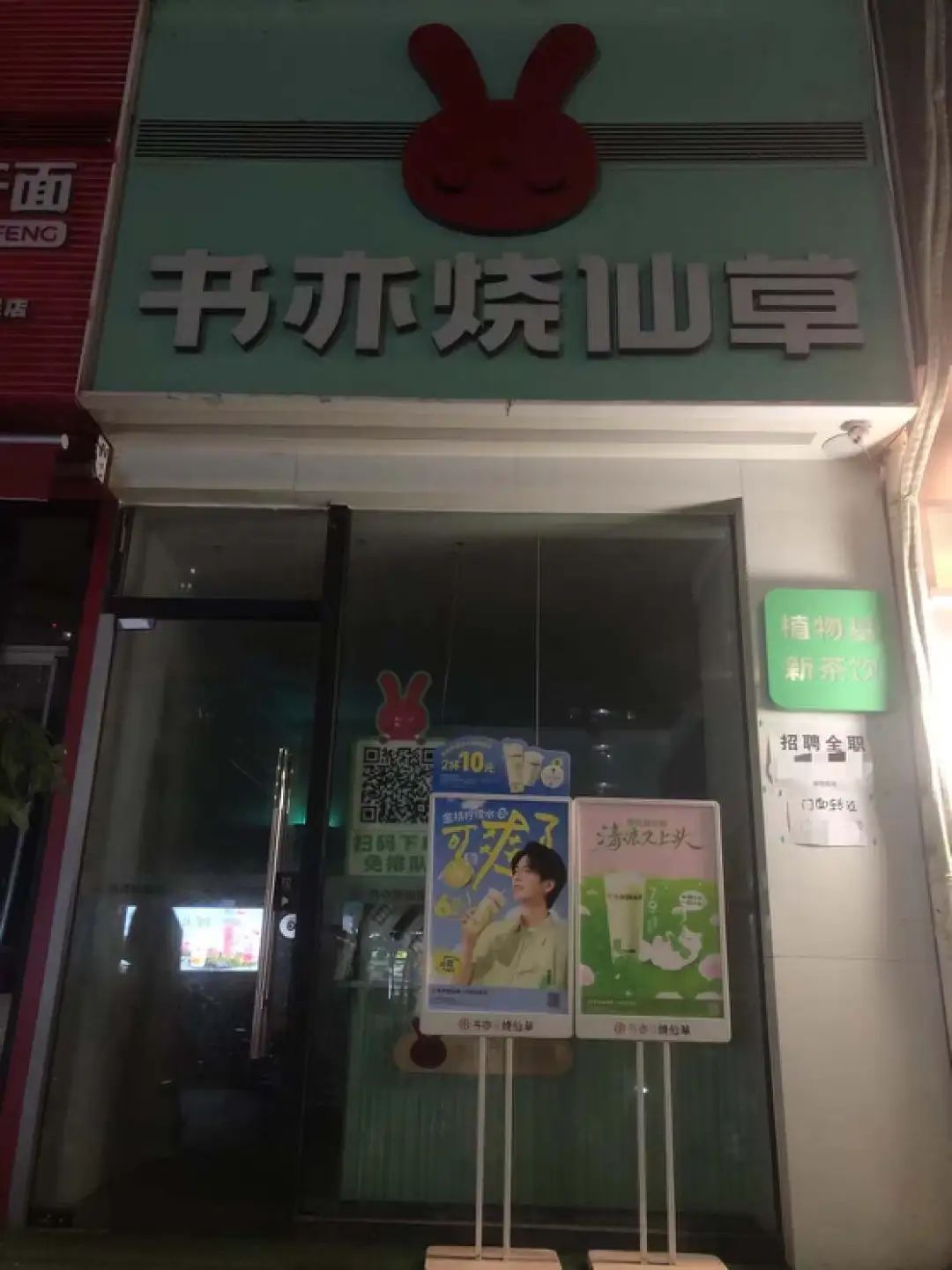 餐觀局周末晚上10點40左右,去探訪某大學的奶茶店,這里有滬上阿姨、古茗、蜜雪冰城、書亦燒仙草,而書亦燒仙草的墻上已貼出了轉讓的告示。