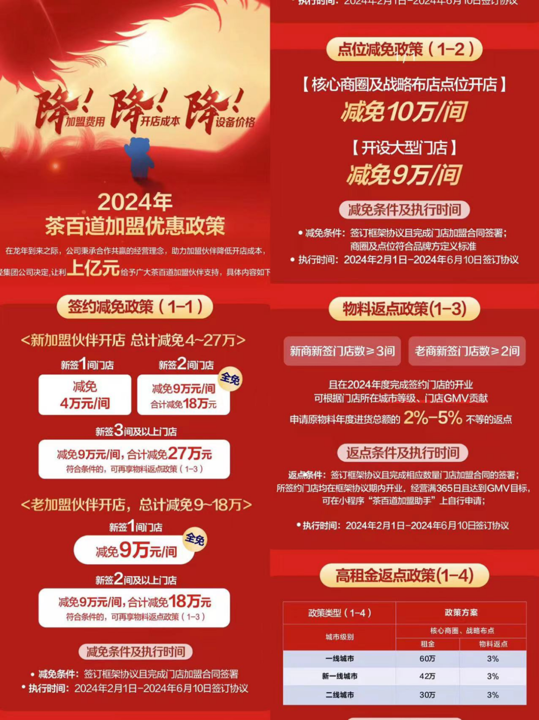 茶百道,新加盟商新簽3家,老加盟商新簽兩家,可申請原物料年度進貨總額的 2%一5%不等的返點。高租金也可以拿3%的物料返點。而且加盟伙伴推薦新客戶成功開店的,加盟伙伴可享原物料返點5000元。