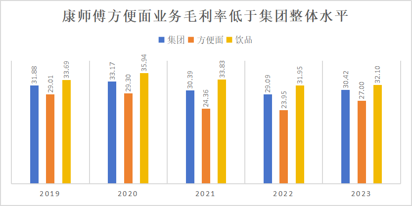 財報顯示,2019-2023年,康師傅方便面的毛利率均低于其飲品和集團整體毛利率。2021年是方便面毛利率的谷底,為24.36%,與飲品業(yè)務和集團整體的毛利率分別相差6.03和9.47個百分點。2023年,方便面業(yè)務的毛利率提升3.05個百分點至27.00%。但2023年其總營收287.93億元,仍然較上年下跌2.84%。