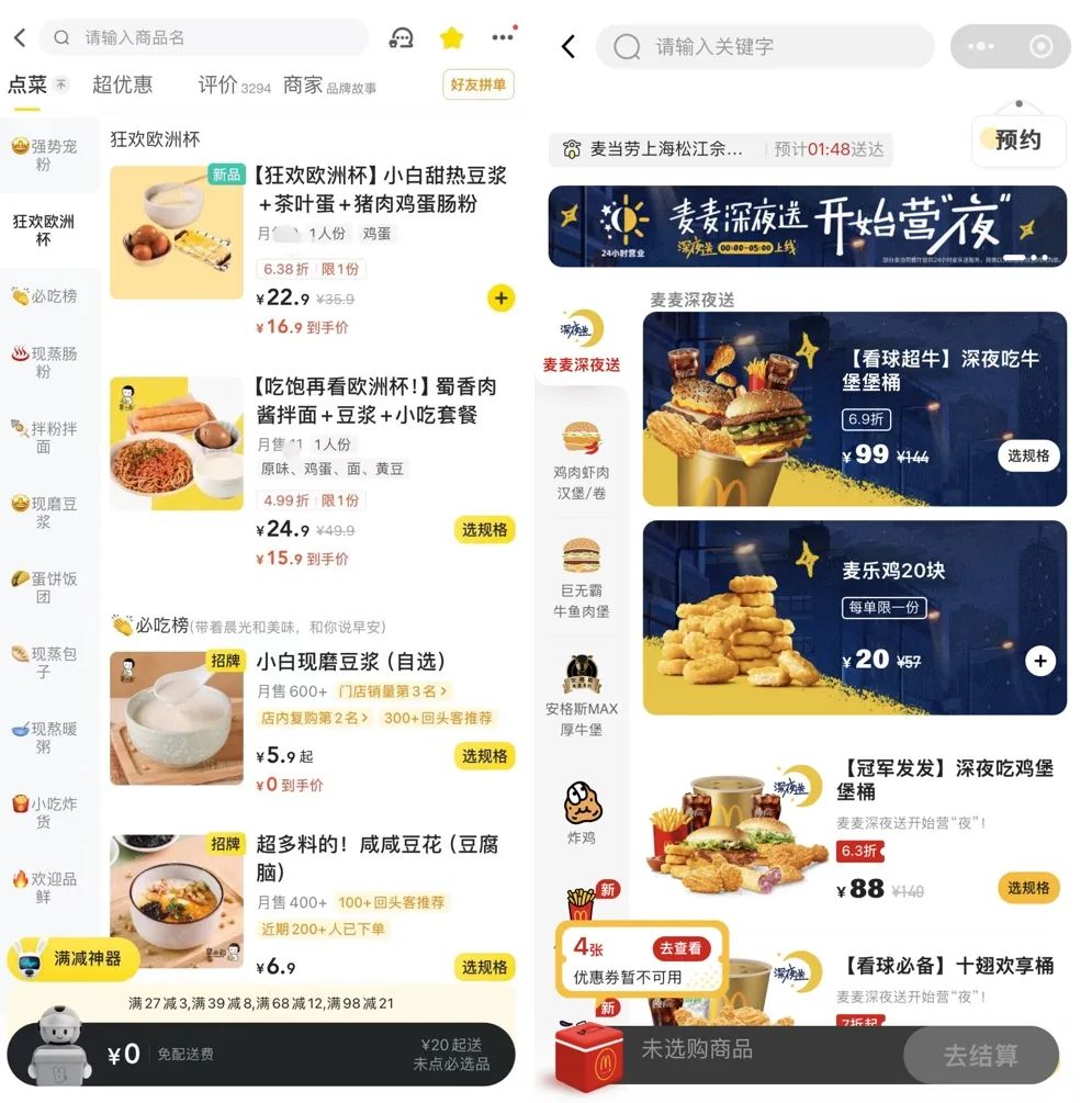 麥當勞在6月15日凌晨才在微博宣布「深夜營業(yè)」,并沒有歐洲杯、足球相關(guān)露出,小程序和外賣平臺的封面依然是20塊20元麥樂雞的活動,點進去,才能看到和足球有關(guān)的套餐。