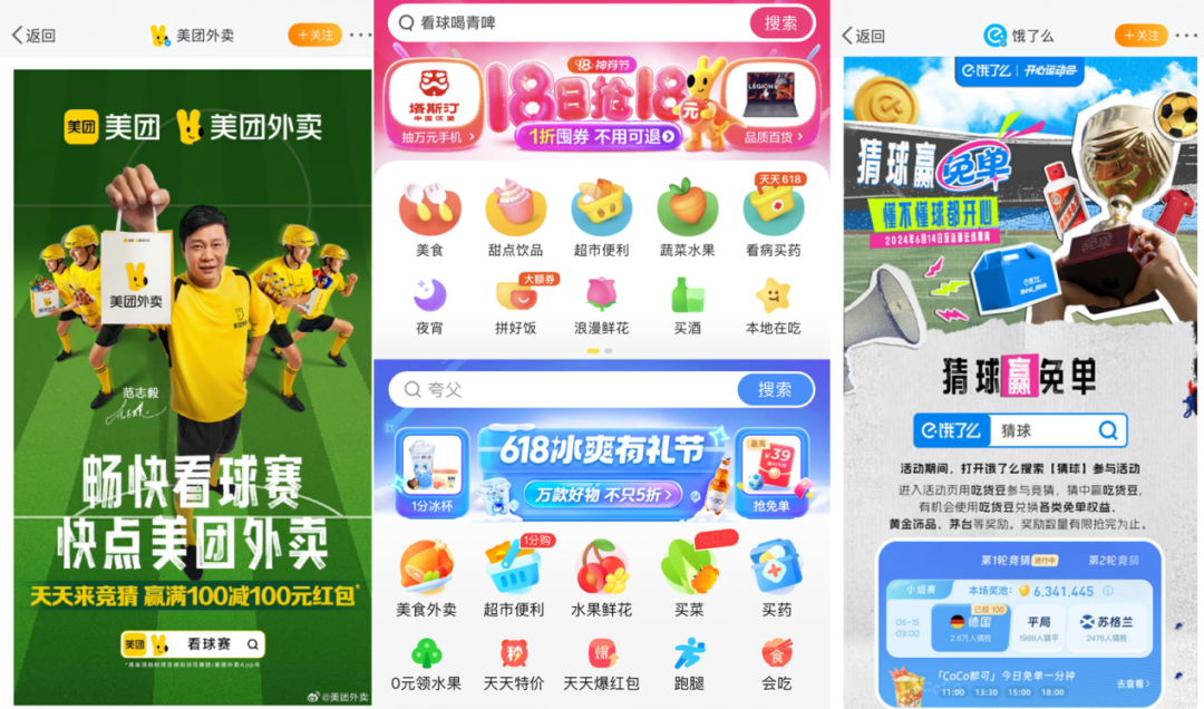 外賣平臺有明確的動作。美團外賣特邀球搭子范志毅,餓了么也推出了「猜球贏免單」的活動,但是相關(guān)活動需要在分別在APP上搜索「看球賽」和「猜球」才能參與。外賣平臺首頁的banner位置,都留給了618。