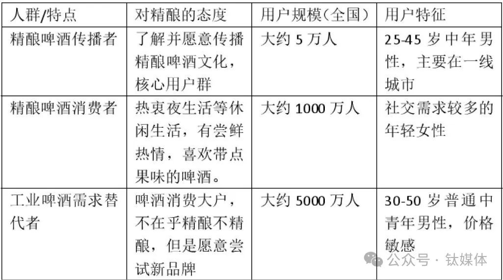 沈愷對(duì)鈦媒體APP分析,精釀啤酒的消費(fèi)人群可以分為三類人群,具體參考下表: