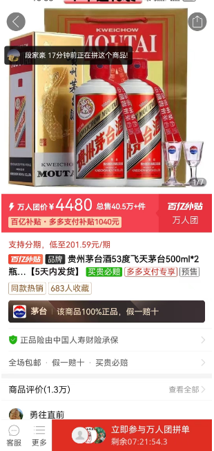 在電商平臺上,茅臺的價(jià)格更低。6月14日,在拼多多、淘寶等電商平臺上,有商鋪上飛天茅臺53度500ml的雙支裝售價(jià)僅4480元,折算為單瓶的價(jià)格已低至2240元/瓶。