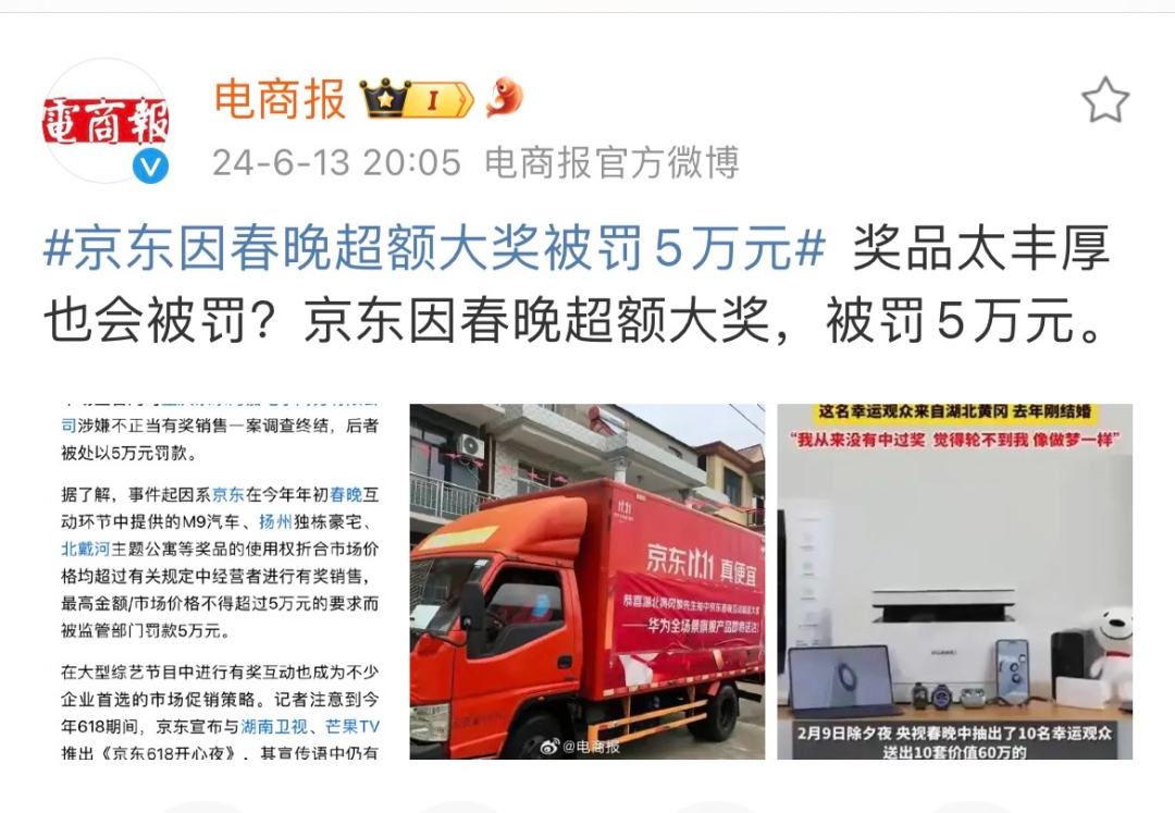 京東被市場(chǎng)監(jiān)管局罰了,原因竟是京東在春晚期間抽獎(jiǎng)的互動(dòng)的獎(jiǎng)品超額了。