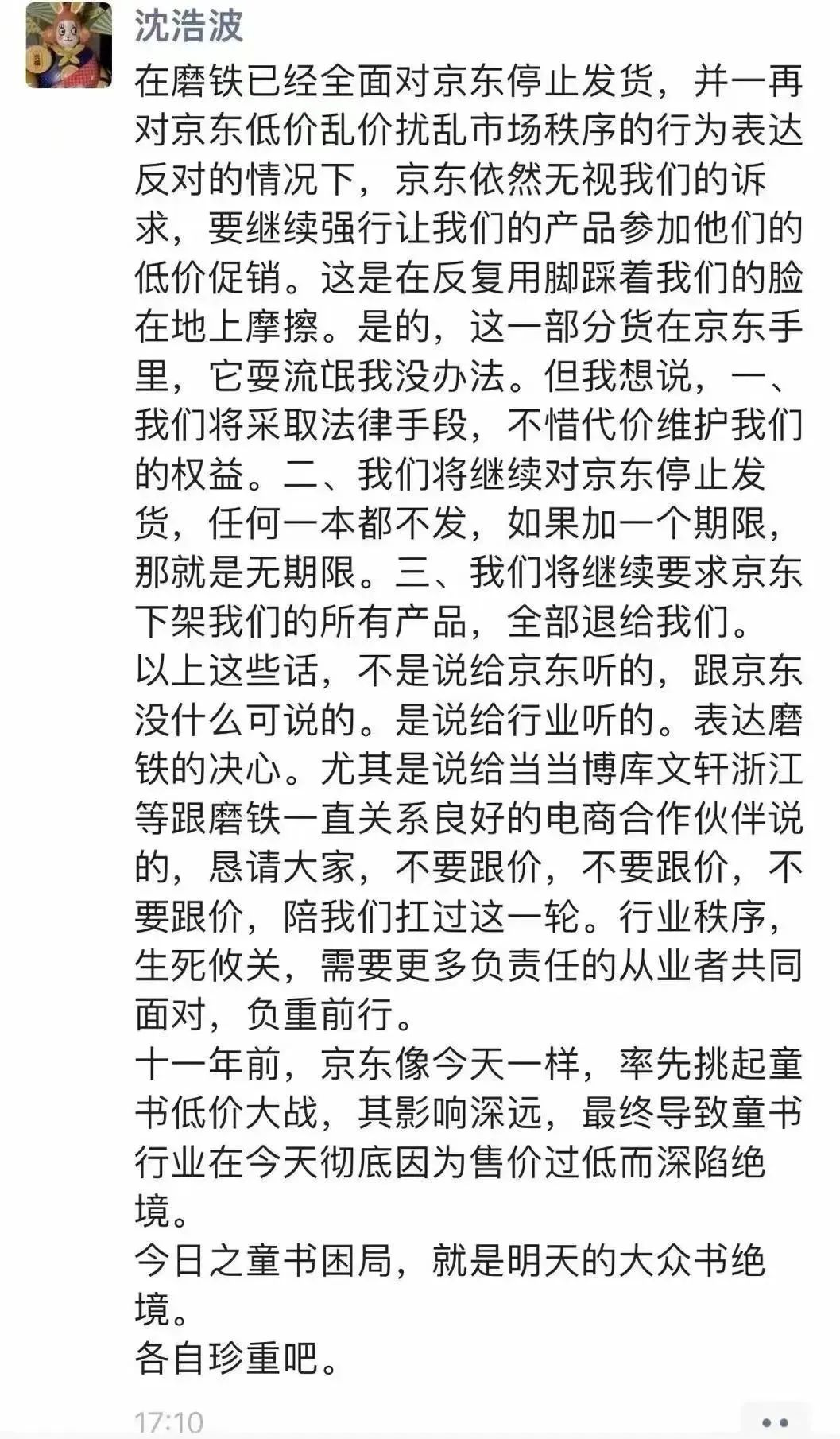沈浩波稱(chēng),“在磨鐵已經(jīng)全面對(duì)京東停止發(fā)貨,并一再對(duì)京東低價(jià)亂價(jià)擾亂市場(chǎng)秩序的行為表達(dá)反對(duì)的情況下,京東依然無(wú)視我們的訴求,要繼續(xù)強(qiáng)行讓我們的產(chǎn)品參加他們的低價(jià)促銷(xiāo)。這是在反復(fù)用腳踩著我們的臉在地上摩擦!