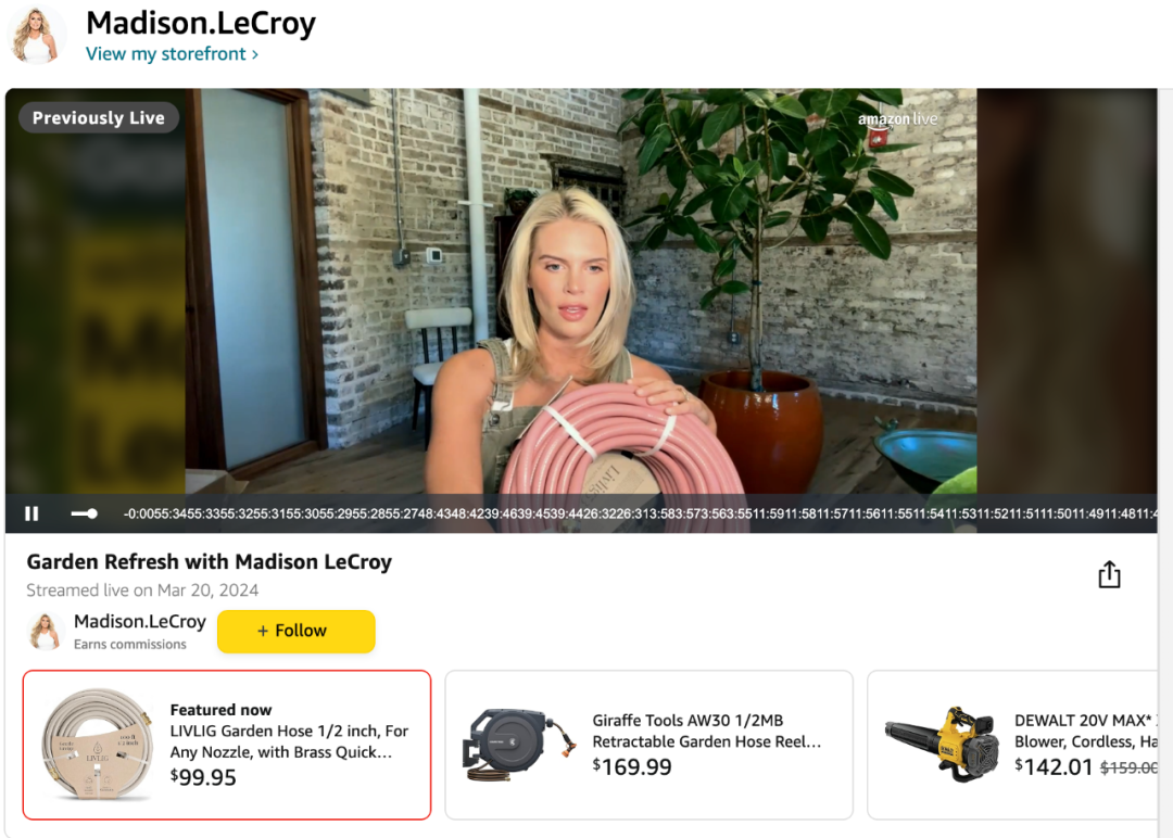 與國內的直播間相比,歐美主播看起來風格更為日常,語氣輕松,很多主播都是在家中進行直播,而不是在辦公場景。往期直播內容會顯示在主頁下方,消費者可以點擊鏈接購買,但主播所售賣的東西并不固定某一品類,可能上個視頻賣美妝產(chǎn)品和服裝,下次直播就是賣水管。