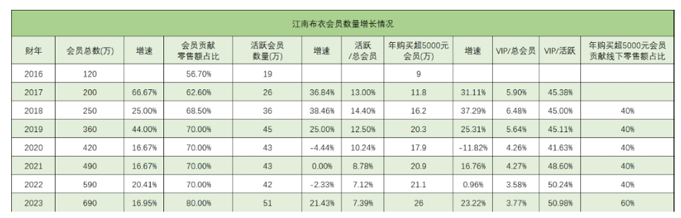 據(jù)公開數(shù)據(jù),至2023年底,江南布衣有740萬名會員,較上年增長50萬名,其中55萬活躍會員(半年內(nèi)購買兩次公司服飾),這些會員貢獻(xiàn)的零售額占比超過八成。特別是購買額超過5000元的會員賬戶數(shù)超過30萬個,他們的消費(fèi)總額高達(dá)43億元,為線下渠道貢獻(xiàn)超過六成的銷售額。