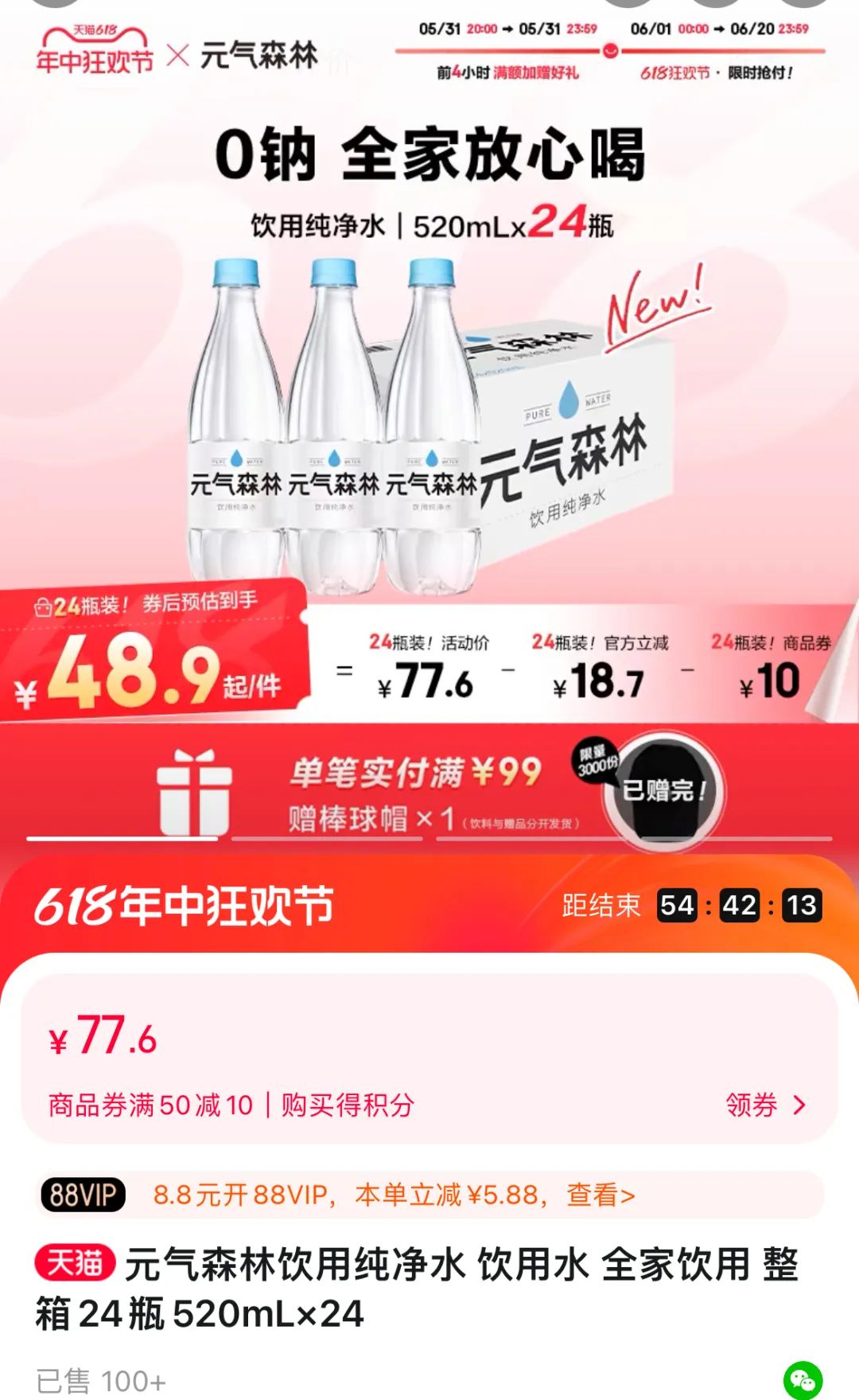 2023年1月,元氣森林在品牌會員中心的微信小程序上線了一款“純凈水”,嘗鮮價為9.9元/3瓶,位于3元價格帶,如今,正式上線的元氣森林飲用純凈水又將價格下調到了2元。