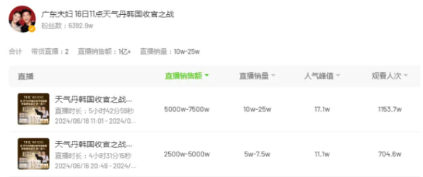 飛瓜數(shù)據(jù)顯示,在6月16日618大促的帶貨直播中,抖音的幾個頭部主播如廣東夫婦、琦兒、潘雨潤的成交額分別為6114萬元、1292.3萬元、674.8萬元,較2023年同期分別下跌86.4%、88.46%、77%。