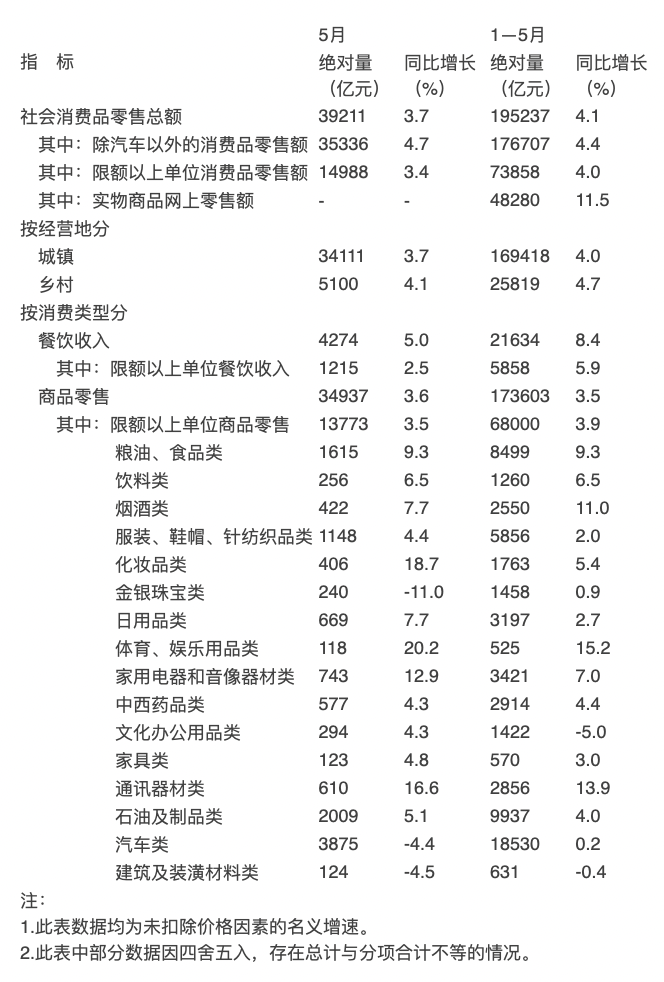按消費(fèi)類型分,5月份,商品零售額34937億元,同比增長3.6%;餐飲收入4274億元,增長5.0%。1-5月份,商品零售額173603億元,增長3.5%;餐飲收入21634億元,增長8.4%。