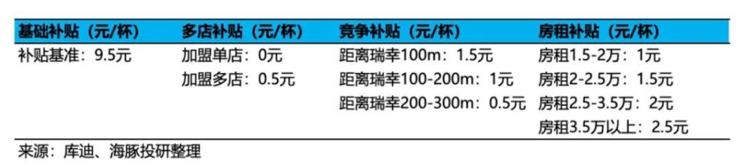 按照海豚投研整理的庫迪補(bǔ)貼政策,庫迪首先有單杯的基礎(chǔ)補(bǔ)貼,即補(bǔ)貼基準(zhǔn)9.5元,只要聯(lián)營商單杯售價(jià)賣不到9.5元,庫迪統(tǒng)一按照9.5元計(jì)算。此外,還有多店補(bǔ)貼,競爭補(bǔ)貼以及房租補(bǔ)貼,如加盟多店單杯再補(bǔ)貼0.5元,距離瑞幸門店越近補(bǔ)貼越多,房租越高補(bǔ)貼越多等。