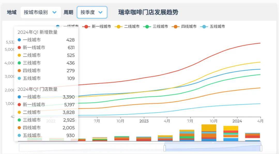 極海監(jiān)測(cè)數(shù)據(jù)顯示,2024年第一季度,瑞幸在二線及以下城市(以下統(tǒng)稱中低線城市)新開1349家門店,該季度中低線城市門店總數(shù)為9688家。無論是新增門店數(shù),還是門店總數(shù),中低線城市都超過了高線城市。