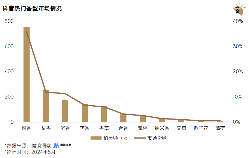 抖音的主流香型是梨香、檀香和沉香,占據(jù)2/3的市場規(guī)模,主打安神助眠、驅(qū)蚊除菌等功效;而緊隨其后的桂花、蜜桃等花香則主打空氣凈化功效。