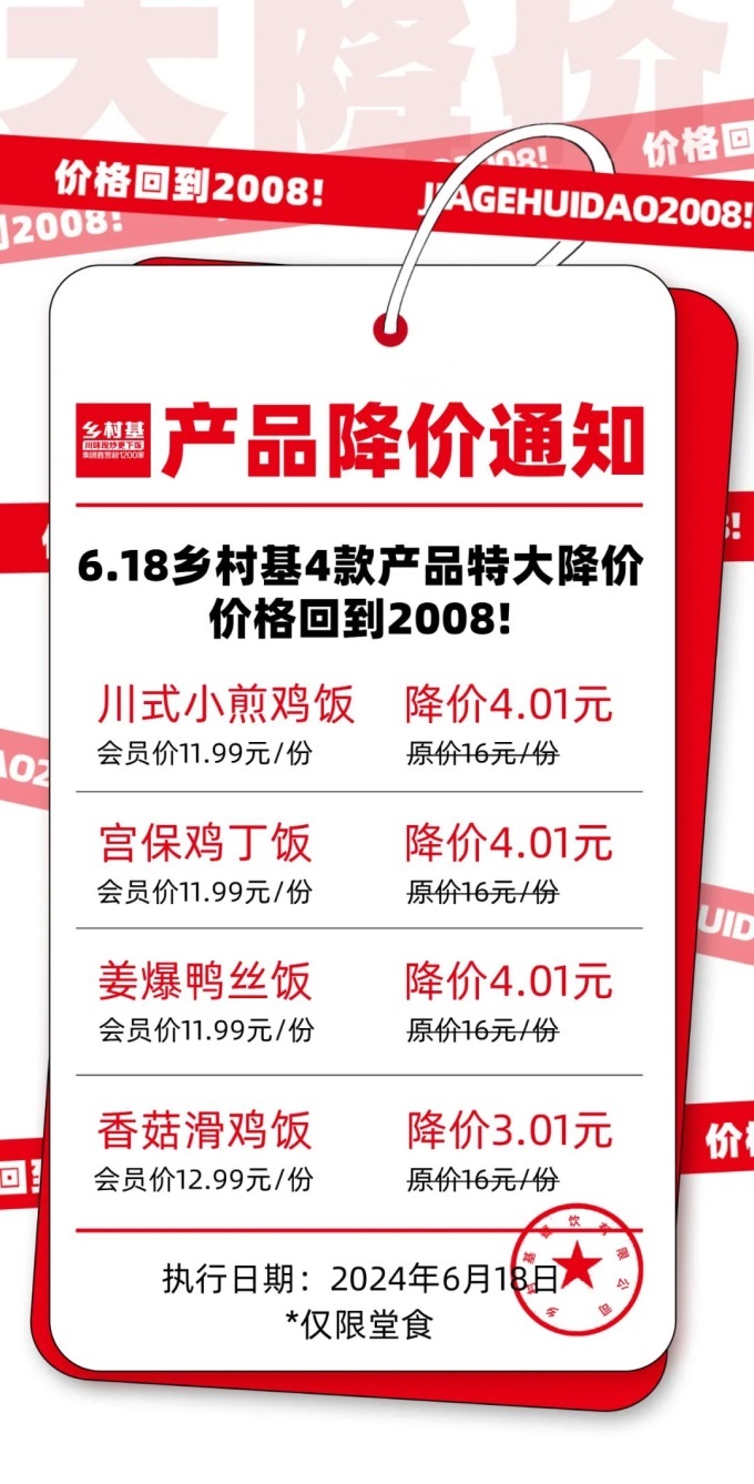 聯(lián)商快訊:6月18日,鄉(xiāng)村基發(fā)布產(chǎn)品降價(jià)通知,宣布其門店的“川式小煎雞飯”“宮保雞丁飯”“姜爆鴨絲飯”“香菇滑雞飯”4款產(chǎn)品降價(jià),“價(jià)格回到2008年”。