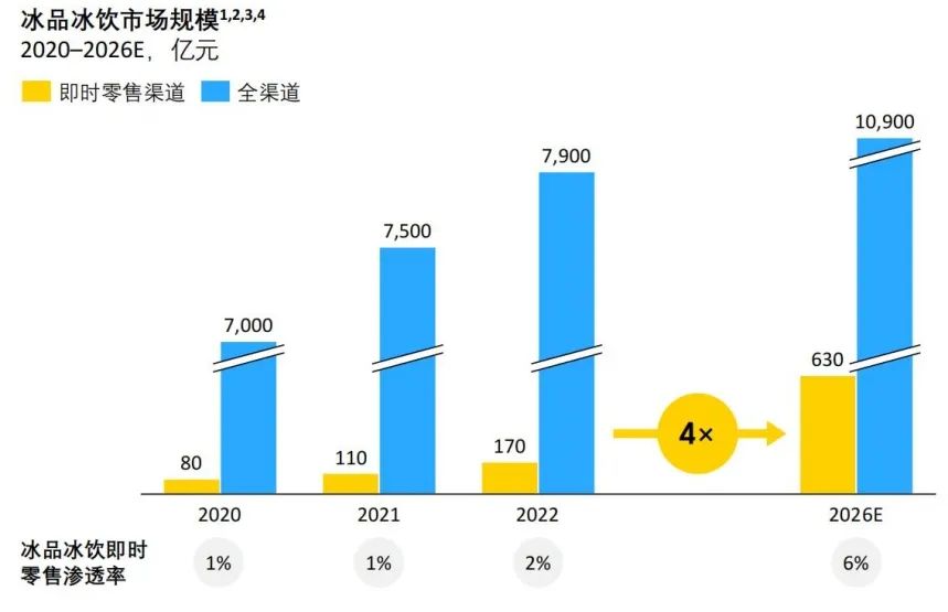 奧緯咨詢(xún)和美團(tuán)閃購(gòu)共同撰寫(xiě)的《2023即時(shí)零售冰品冰飲消費(fèi)趨勢(shì)白皮書(shū)》就預(yù)測(cè),未來(lái)三年冰品冰飲在即時(shí)零售渠道增速預(yù)計(jì)將達(dá)到39%,遠(yuǎn)超全渠道8%的增速。預(yù)計(jì)2026年,冰品冰飲即時(shí)零售銷(xiāo)售規(guī)模將實(shí)現(xiàn)超過(guò)四倍增長(zhǎng),有望突破630億元,冰品冰飲有望成為即時(shí)零售的標(biāo)志性品類(lèi)。