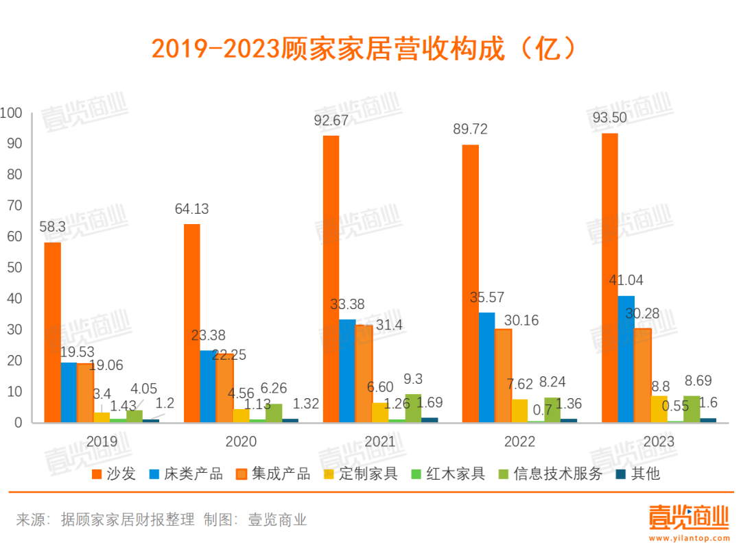 具體到各個(gè)產(chǎn)品來看,顧家家居主要營(yíng)收由銷售沙發(fā)、床類產(chǎn)品、集成產(chǎn)品、定制家具、紅木家具、信息技術(shù)服務(wù)組成,其中營(yíng)收占比最高是沙發(fā)類產(chǎn)品,2023年?duì)I收93.50億元。