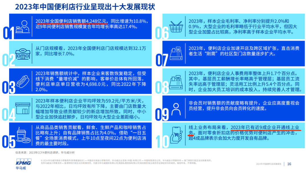 結(jié)合畢馬威與中國(guó)連鎖經(jīng)營(yíng)協(xié)會(huì)最新發(fā)布的《2024年中國(guó)便利店發(fā)展報(bào)告》來看,最值得關(guān)注的兩點(diǎn)趨勢(shì)是:其一,行業(yè)發(fā)展態(tài)勢(shì)良好,2023年全年銷售額達(dá)到4248億元,同比增速達(dá)10.8%,門店規(guī)模突破32.1萬家,同比增長(zhǎng)7.0%;其二,已有近九成便利店企業(yè)開通線上業(yè)務(wù),尋找新增量。